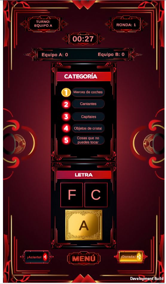 - The Challenge: During their turn, each team must say as many words as possible belonging to the active category and starting with one of the letters on the screen. Think fast before the timer hits zero!