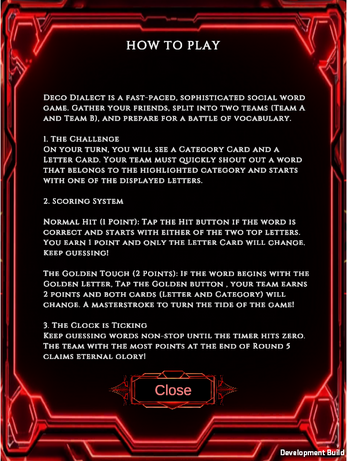 Deco Dialect is a premium social word game, designed for those who love quick-thinking challenges and sophisticated aesthetics. Gather your friends, split into teams, and prepare for a vocabulary battle under a stunning Art Deco-Neon visual style.